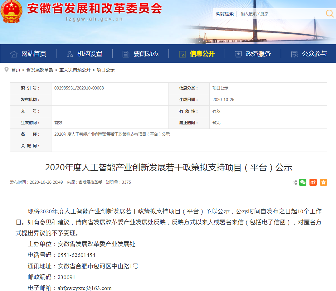 近日,安徽省发展和改革委员会公示了2020年度人工智能产业创新发展若干政策拟支持项目(平台)。欧陆注册信息申报的数据安全协同运营平台项目获得该项政策支持,并且顺利通过评选,进入公示阶段!
