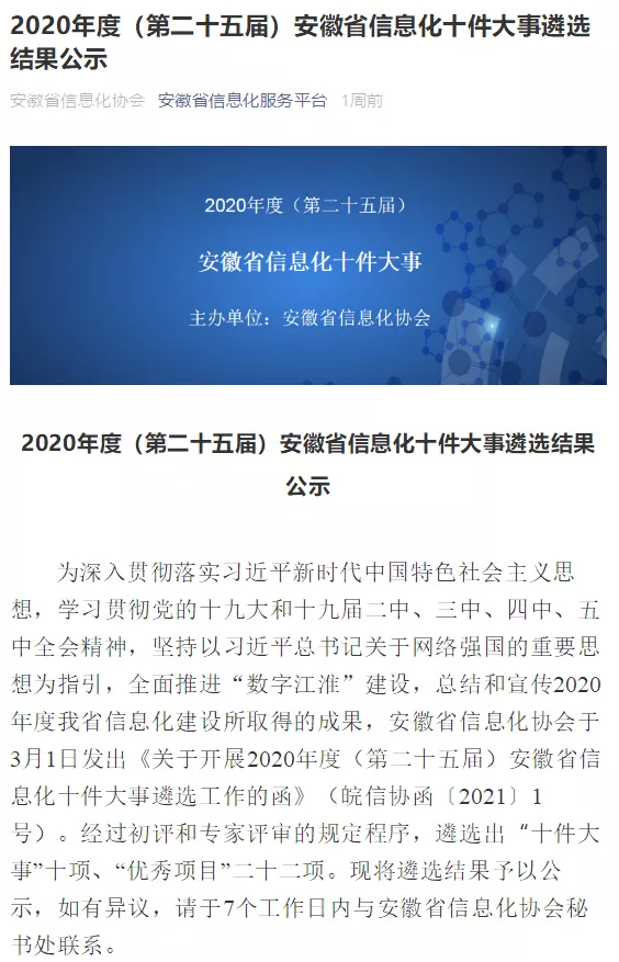 近日,安徽省信息化协会公示了2020年度(第二十五届)安徽省信息化十件大事遴选结果,欧陆注册信息申报的“芜湖市信息资源安全治理项目”经过初评和专家评审,成功入选2020年度安徽省信息化十件大事,标志着我公司信息化建设再上新台阶。