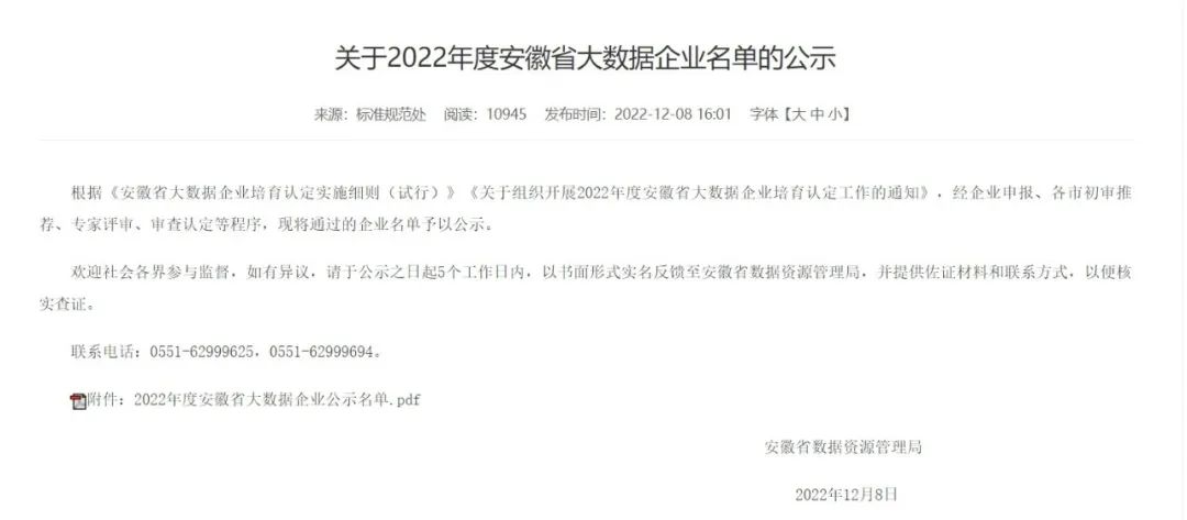 ? ? ? ?近日,?根据《安徽省大数据企业培育认定实施细则(试行)》的文件精神,经市级初审、专家评审等流程,安徽省数据资源管理局公布了《关于2022年度安徽省大数据企业名单的公示》,安徽欧陆注册成功通过评审,经认定成为2022年度安徽省大数据企业!